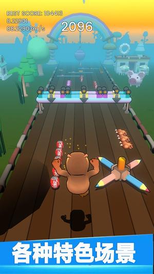 3、拾取沿途金币与道具提升分数与能力,利用特殊路段如弹跳垫、秋千等设施快速穿越危险区域。