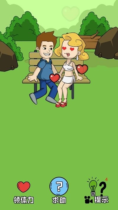 3、观卡通关卡画面,看左侧邀请男士和右侧拿花女士,按红箭头提示关注右侧金发女士,完成情感连线任务。